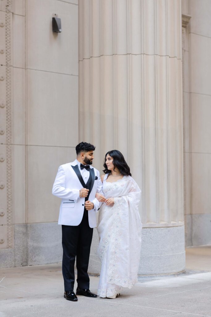 We began our session at The Rookery Building, one of Chicago’s most breathtaking architectural treasures. With its sweeping staircases and historic charm, it offered the perfect setting for their first look. The groom-to-be started in a sharp black tuxedo, while the bride-to-be wore a stunning saree. Together, they brought a sense of timeless elegance and cultural beauty into this historic Chicago landmark.
