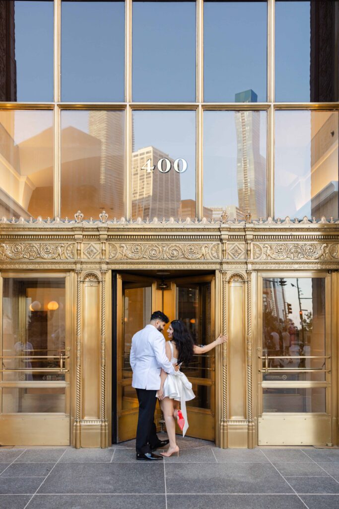 Next, we moved outdoors to the Chicago Board of Trade. This area is one of my all-time favorite downtown locations for engagement photos. Surrounded by dramatic Art Deco buildings, the couple’s formal attire looked cinematic against the cityscape. The tall lines of the buildings framed them perfectly, creating that classic, editorial feel that Chicago is known for.