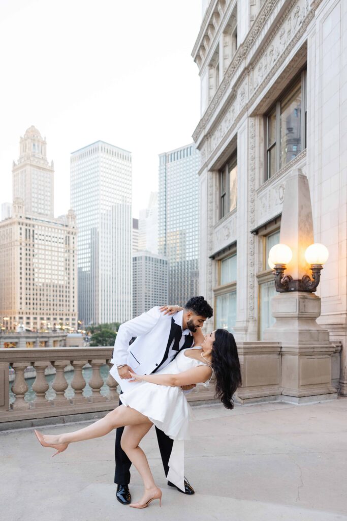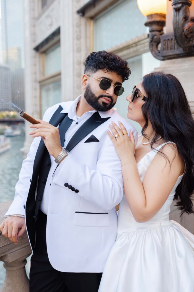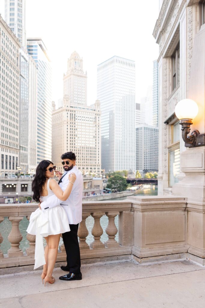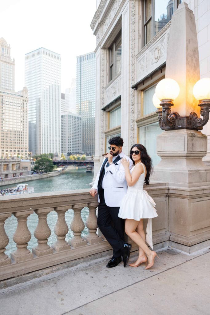 As the sun set, we finished the evening at the Wrigley Building. Here, the couple switched up their look for a more playful, yet still elegant vibe for their downtown Chicago engagement. The groom-to-be changed into a white tuxedo, tie undone for a relaxed, effortless style. The bride-to-be looked radiant in a short white dress with a statement bow in the back a modern, chic choice that made her glow against the twinkling lights of Michigan Avenue. Add in sunglasses and cigars, and the whole look was pure vintage-meets-classic cool.